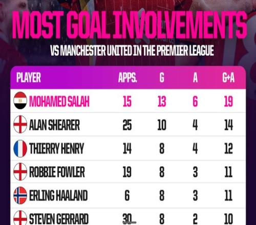 在过往的交锋中,曼联可以说是利物浦球星萨拉赫“最喜欢”的对手之一,截至目前他已在英超联赛中对阵曼联15次,总计打入13粒进球,贡献6次助攻,进球数与制造进球数均为英超历史第一。