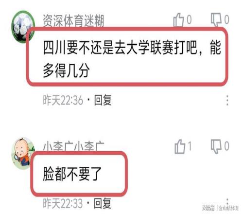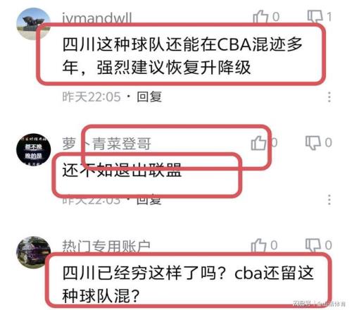 “一节6分,还留在中国篮球顶级联赛”;“半场得16分,这是不是CBA有史以来第一次。”;“四川已经穷这样了吗?cba还留这种球队混?四川这种球队还能在CBA混迹多年”;“,,强烈建议恢复升降级”;“还不如退出联盟”;“按某些人的观点,四川队国内球员得到锻炼了”;“CBA的四川,WCBA的浙江,NBL的张家口纯属搞笑的,一个外援不请,场场惨案,有啥意义?”……