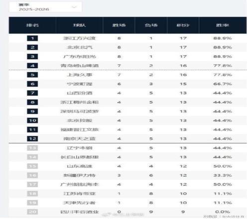 山西汾酒、浙江稠州金租、深圳马可波罗、北京控股、福建晋江文旅、南京天之蓝、辽宁本纲、以及吉林长白山恩都里。以上8支球队,战绩均为4胜5负,分列积分榜第7至14位。