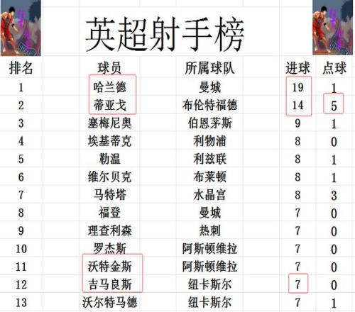 射手榜方面,哈兰德错失良机未能进球,还是19球领跑。蒂亚戈今天上演帽子戏法,大幅度缩小和哈兰德差距,5球之差仍排第2。吉马良斯今天打入一球,追上福登,理查利森,罗杰斯等人7球刚好挤入前十。