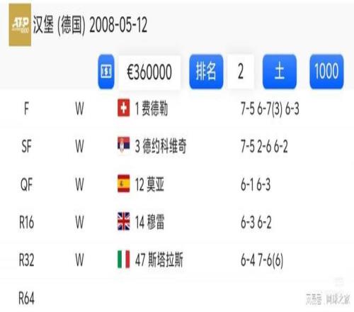 纳达尔在当时还未降档的汉堡赛上也是战绩不俗。进入十六强后,依次战胜穆雷、莫亚、德约和费德勒夺冠。