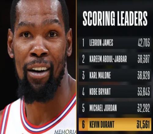 凯文·杜兰特继续在联盟历史总得分榜上攀升。