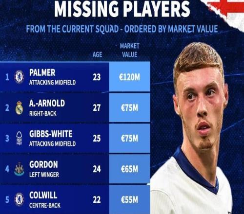 北京时间11月17日,在英格兰以7战全胜,打进22球0丢球的成绩挺进2026年美加墨世界杯之后,德转列出了此次未入选英格兰代表身价排名前10的球员,身价达到1.2亿欧元的帕尔默排名第一,